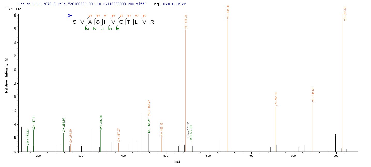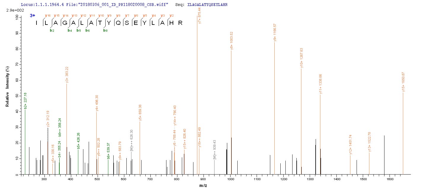 Based on the SEQUEST from database of E.coli host and target protein, the LC-MS/MS Analysis result of CSB-EP356423BUA could indicate that this peptide derived from E.coli-expressed Bordetella pertussis (strain Tohama I / ATCC BAA-589 / NCTC 13251) ptxA.