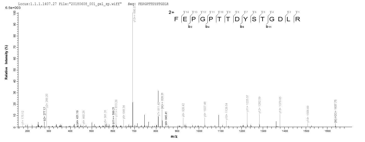 Based on the SEQUEST from database of Yeast host and target protein, the LC-MS/MS Analysis result of CSB-YP356626BUA could indicate that this peptide derived from Yeast-expressed Bordetella pertussis (strain Tohama I / ATCC BAA-589 / NCTC 13251) fim2.