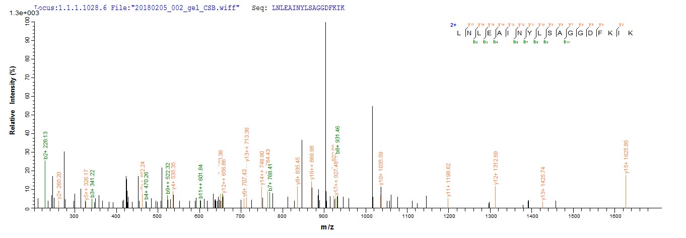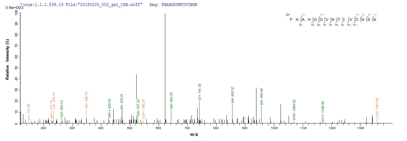 Based on the SEQUEST from database of E.coli host and target protein, the LC-MS/MS Analysis result of CSB-EP012882BO could indicate that this peptide derived from E.coli-expressed Bos taurus (Bovine) LGALS1.