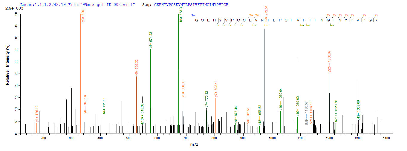 Based on the SEQUEST from database of E.coli host and target protein, the LC-MS/MS Analysis result of CSB-EP644917BO could indicate that this peptide derived from E.coli-expressed Bos taurus (Bovine) PAG1.