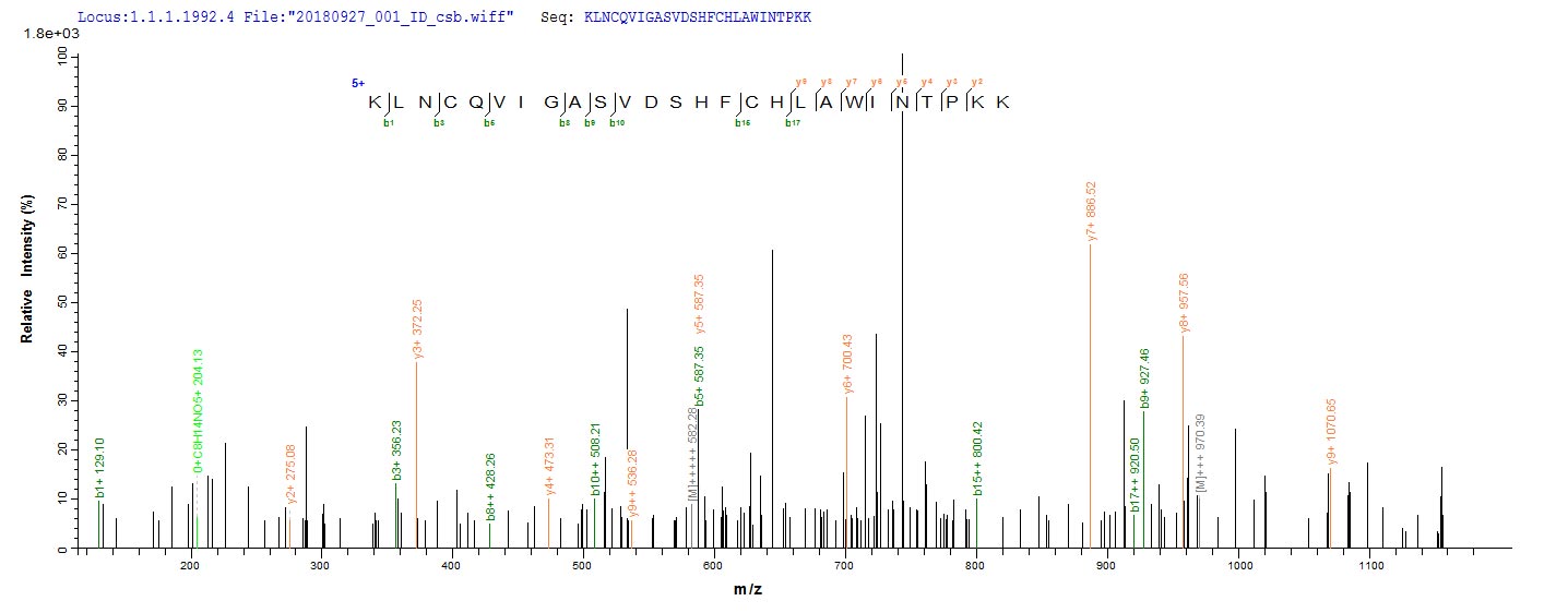 Based on the SEQUEST from database of Yeast host and target protein, the LC-MS/MS Analysis result of CSB-YP872876DXU could indicate that this peptide derived from Yeast-expressed Cricetulus griseus (Chinese hamster) (Cricetulus barabensis griseus) PRDX1.