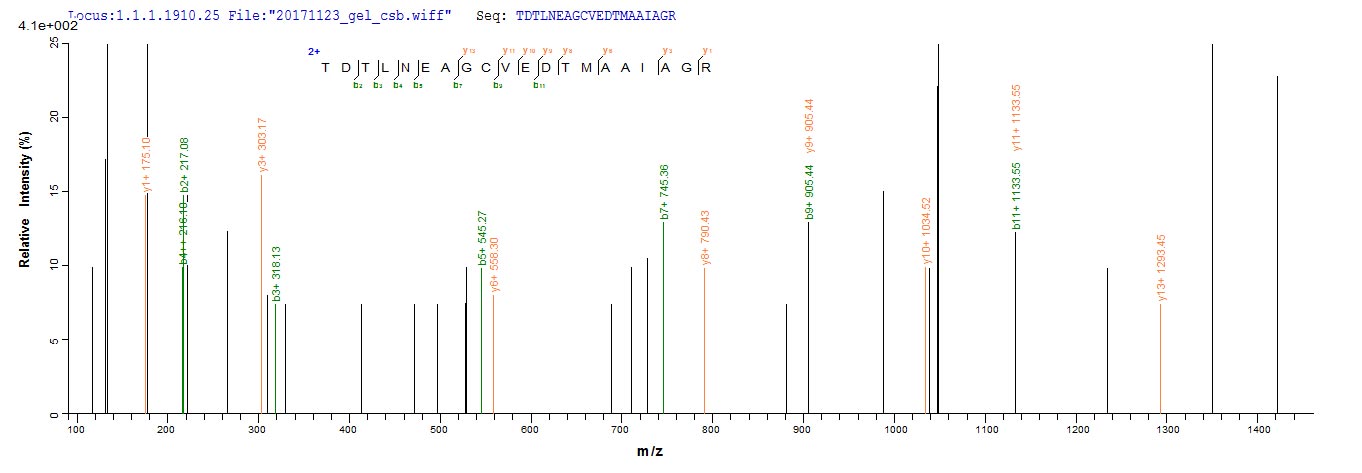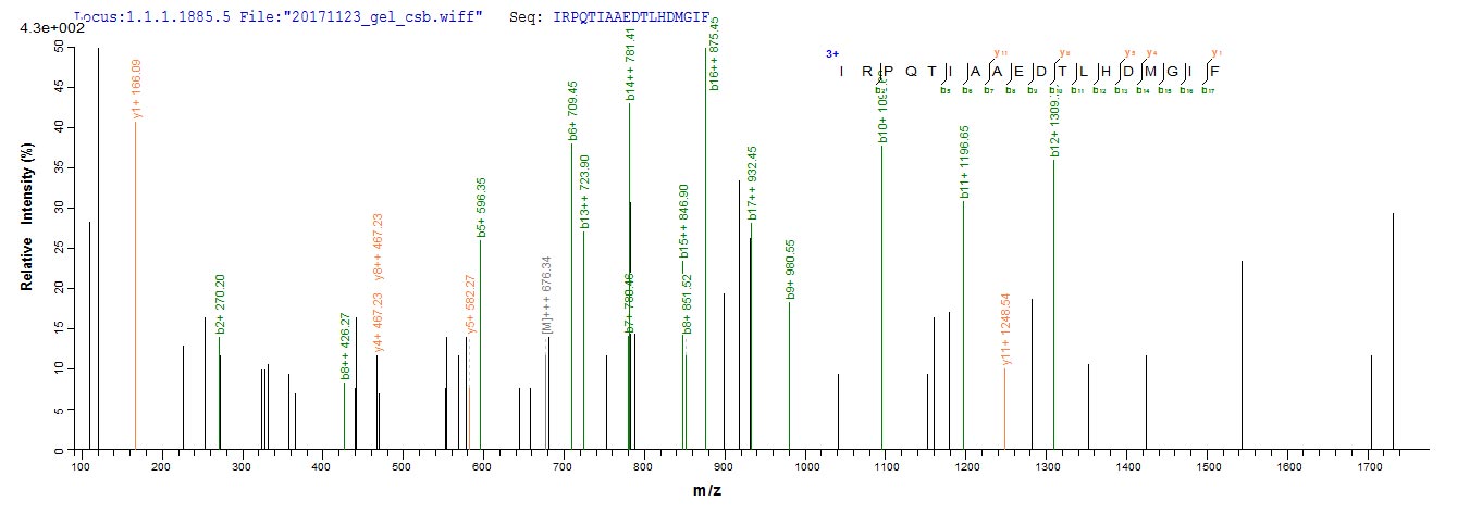 Based on the SEQUEST from database of Yeast host and target protein, the LC-MS/MS Analysis result of CSB-YP300910HUV could indicate that this peptide derived from Yeast-expressed Helicobacter pylori (strain ATCC 700392 / 26695) (Campylobacter pylori) ureB.