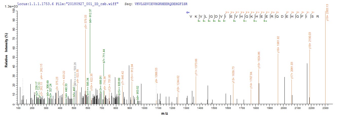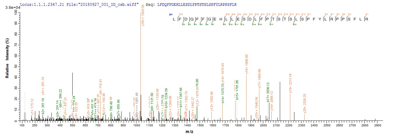 Based on the SEQUEST from database of E.coli host and target protein, the LC-MS/MS Analysis result of CSB-EP006008HU could indicate that this peptide derived from E.coli-expressed Homo sapiens (Human) CRYAB.