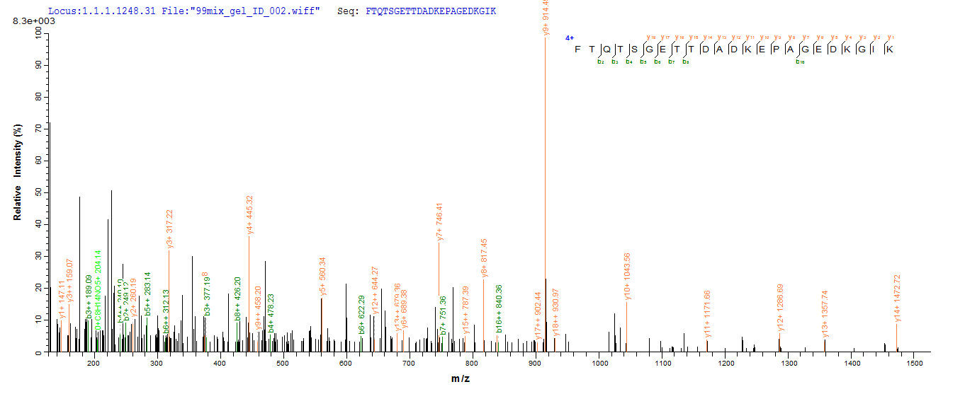 Based on the SEQUEST from database of E.coli host and target protein, the LC-MS/MS Analysis result of CSB-EP014597HU(A5) could indicate that this peptide derived from E.coli-expressed Homo sapiens (Human) MKI67.
