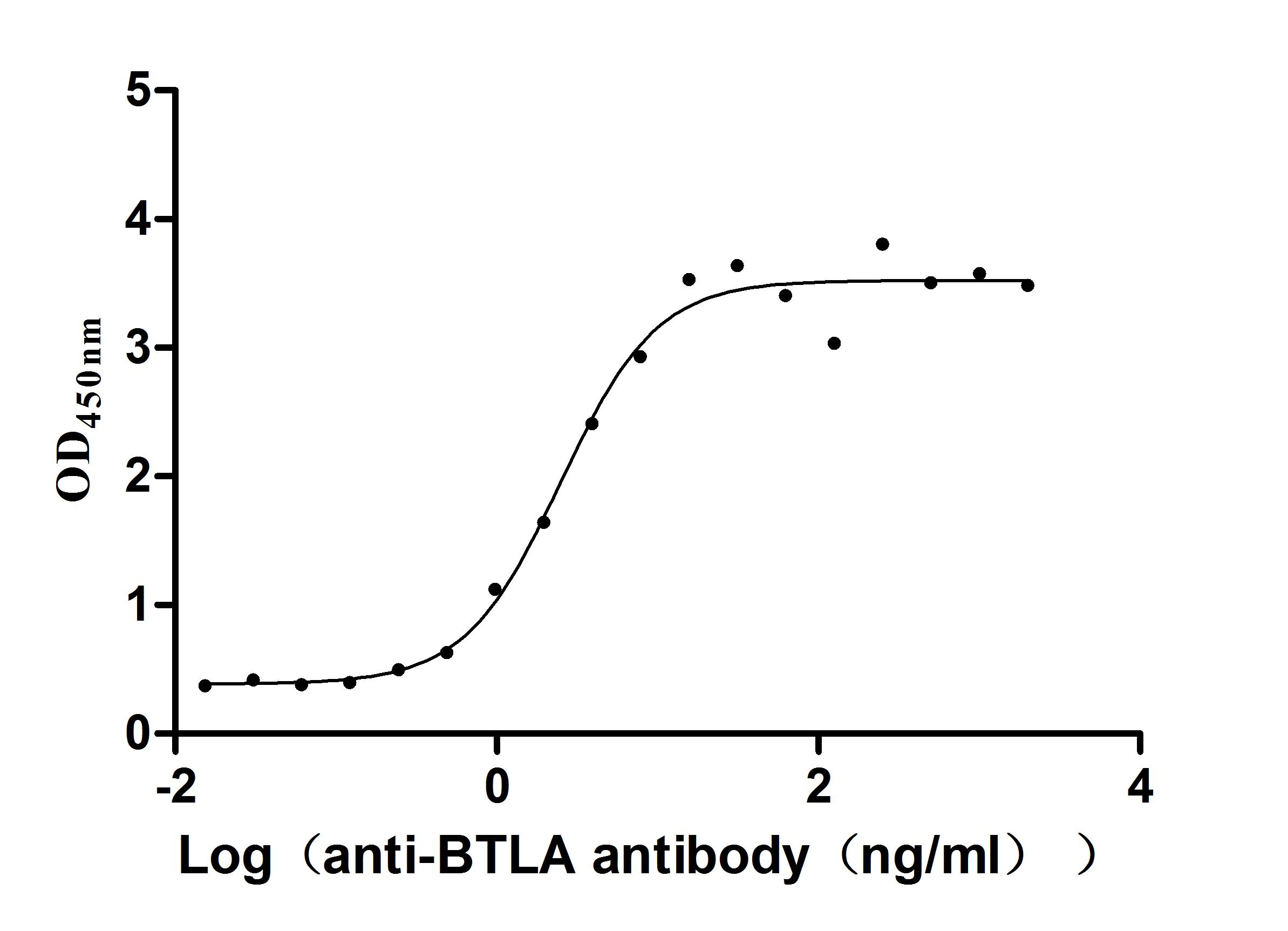 Measured by its binding ability in a functional ELISA. Immobilized Human BTLA at 2μg/ml can bind Anti-BTLA recombinant antibody(CSB-RA773799MAIHU), the EC50 is 1.763-3.542 ng/mL. Biological Activity Assay