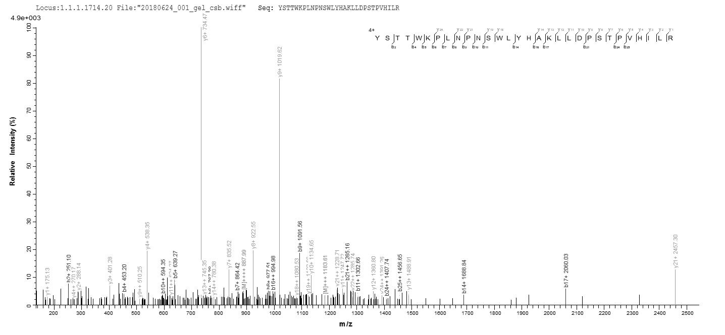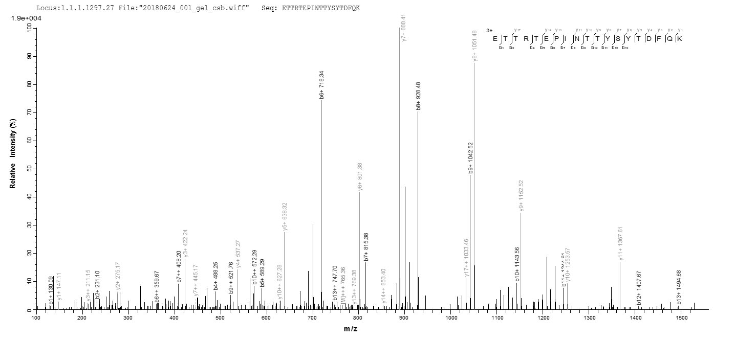 Based on the SEQUEST from database of E.coli host and target protein, the LC-MS/MS Analysis result of CSB-EP865168HU could indicate that this peptide derived from E.coli-expressed Homo sapiens (Human) DCAF16.