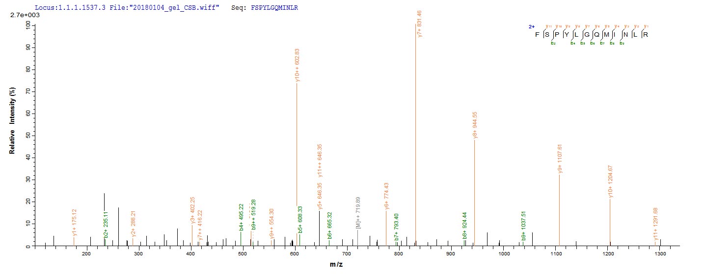 Based on the SEQUEST from database of Yeast host and target protein, the LC-MS/MS Analysis result of CSB-YP018603HU could indicate that this peptide derived from Yeast-expressed Homo sapiens (Human) PRAME.