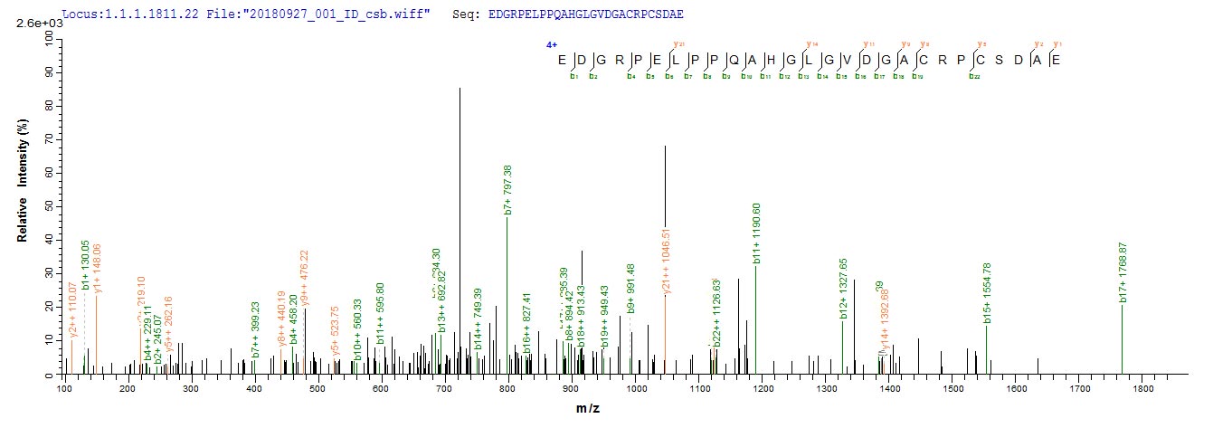 Based on the SEQUEST from database of E.coli host and target protein, the LC-MS/MS Analysis result of CSB-EP892322HU could indicate that this peptide derived from E.coli-expressed Homo sapiens (Human) METRN.