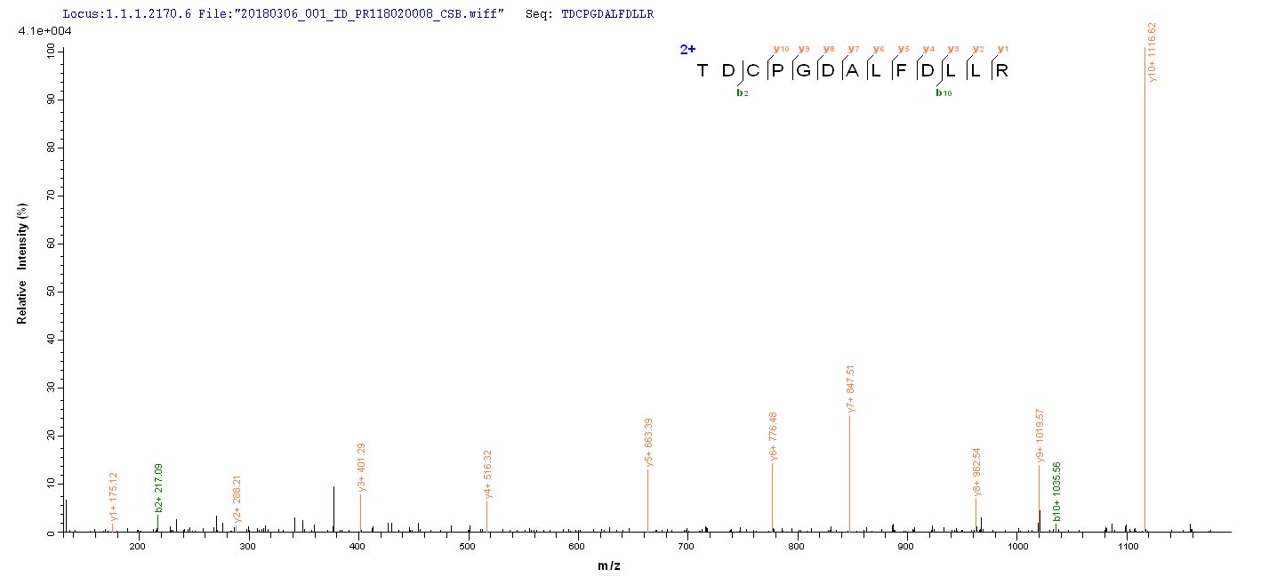 Based on the SEQUEST from database of Yeast host and target protein, the LC-MS/MS Analysis result of CSB-YP846684HU could indicate that this peptide derived from Yeast-expressed Homo sapiens (Human) PGLYRP2.