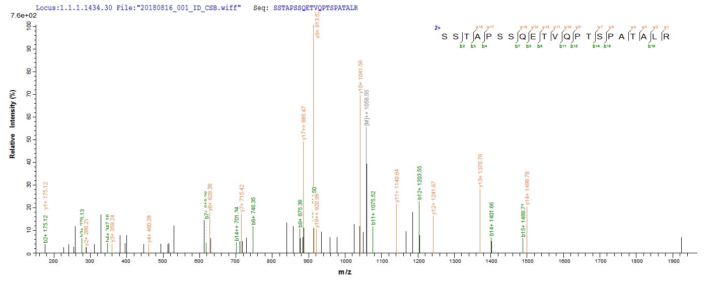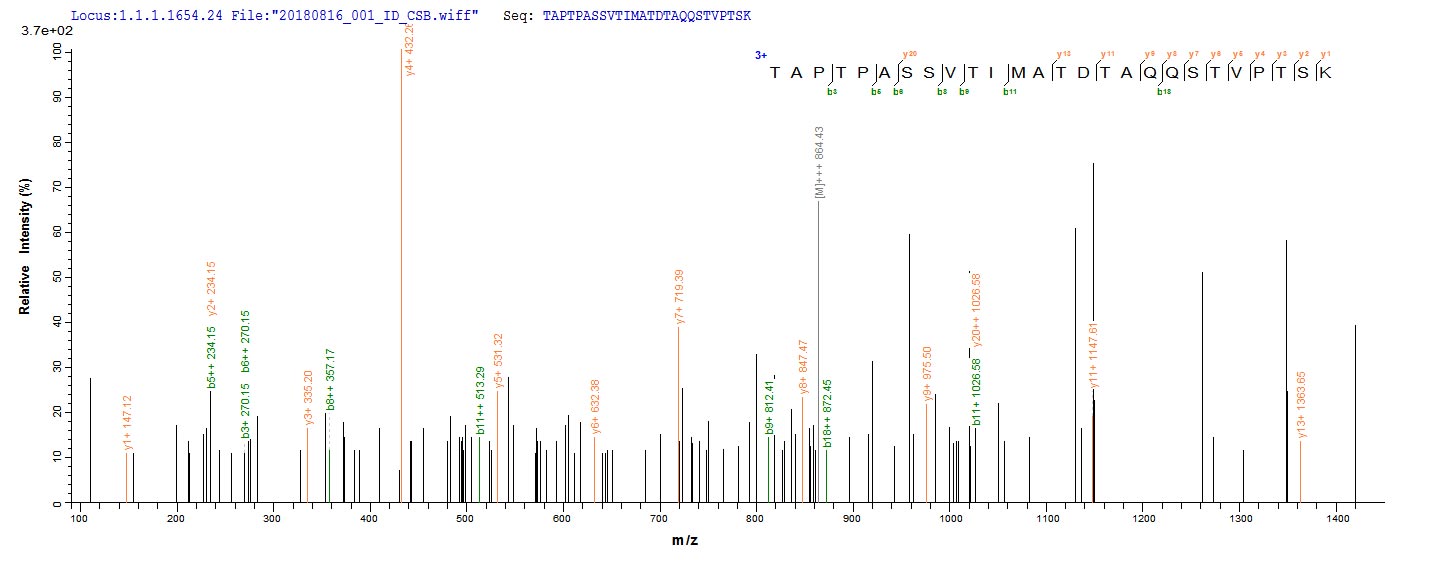Based on the SEQUEST from database of E.coli host and target protein, the LC-MS/MS Analysis result of CSB-EP518830HU could indicate that this peptide derived from E.coli-expressed Homo sapiens (Human) PODXL.