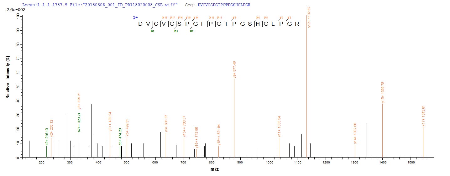 氨基酸序列EVKDVCVGSPGIPGTPGSHGLPGRDGRDGLKGDPGPPGPMGPPGEMPCPPGNDGLPGAPGIPGECGEKGEPGERGPPGLPAHLDEELQATLHDFRHQILQTRGALSLQGSIMTVGEKVFSSNGQSITFDAIQEACARAGGRIAVPRNPEENEAIASFVKKYNTYAYVGLTEGPSPGDFRYSDGTPVNYTNWYRGEPAGRGKEQCVEMYTDGQWNDRNCLYSRLTICEF