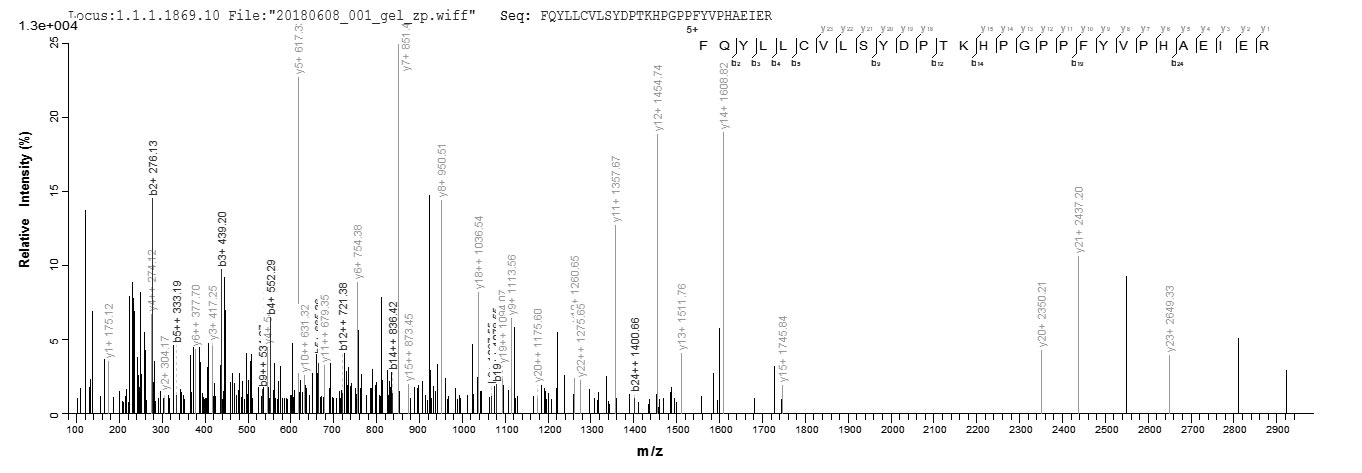 Based on the SEQUEST from database of E.coli host and target protein, the LC-MS/MS Analysis result of CSB-RP005854h could indicate that this peptide derived from E.coli-expressed Homo sapiens (Human) TPMT.