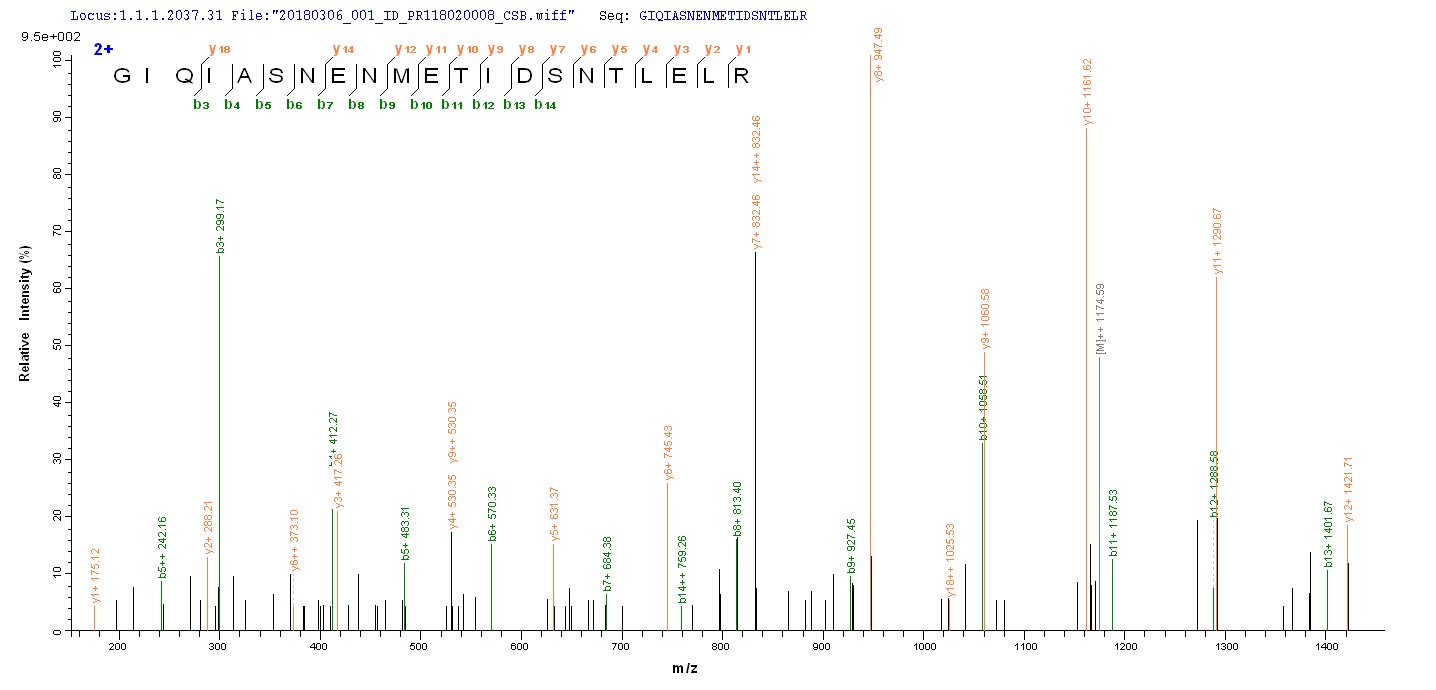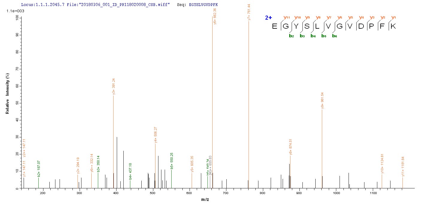 Based on the SEQUEST from database of E.coli host and target protein, the LC-MS/MS Analysis result of CSB-EP325878IMI could indicate that this peptide derived from E.coli-expressed Influenza A virus (strain A/Equine/Prague/1/1956 H7N7) NP.