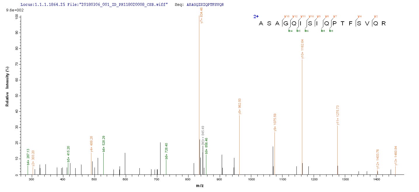 Based on the SEQUEST from database of E.coli host and target protein, the LC-MS/MS Analysis result of CSB-EP323566IEC could indicate that this peptide derived from E.coli-expressed Influenza A virus (strain A/Fort Warren/1/1950 H1N1) NP.