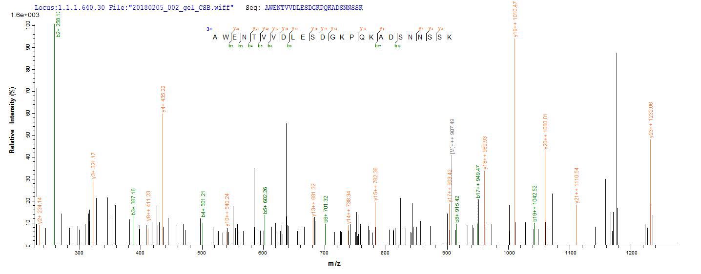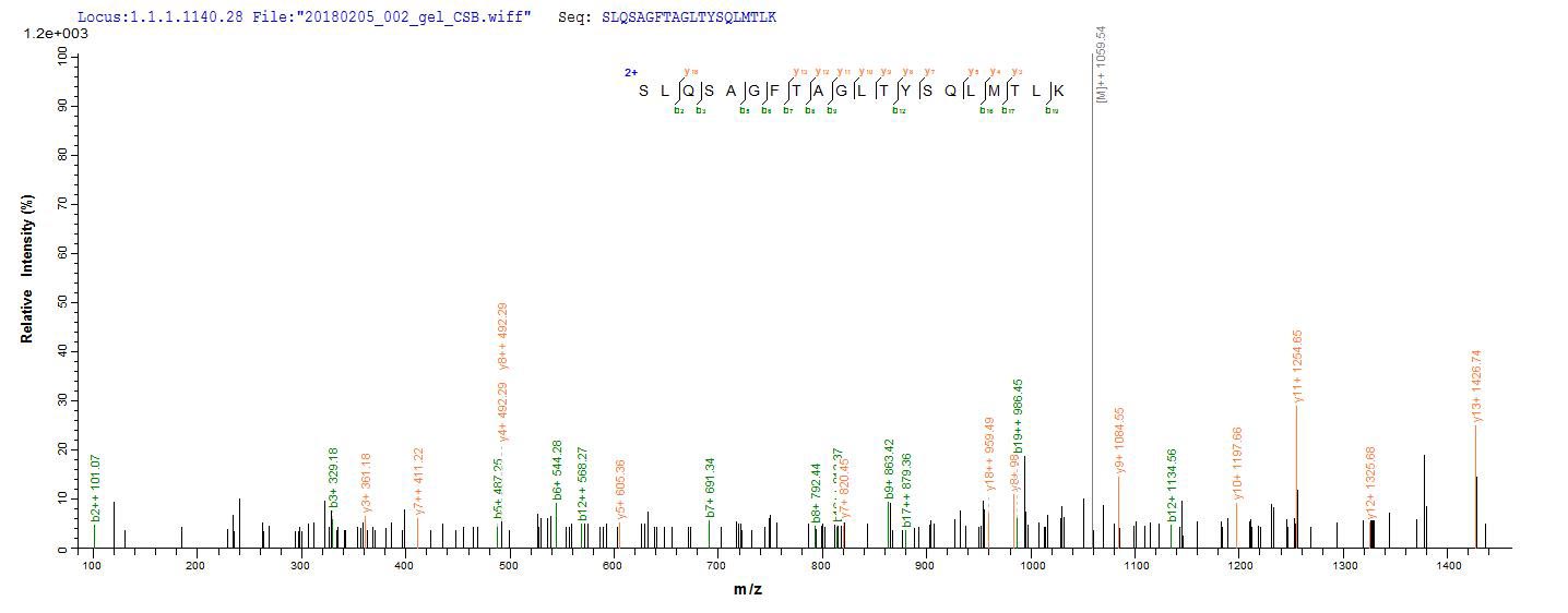 Based on the SEQUEST from database of E.coli host and target protein, the LC-MS/MS Analysis result of CSB-EP318401LNPe1 could indicate that this peptide derived from E.coli-expressed Lassa virus (strain Mouse/Sierra Leone/Josiah/1976) (LASV) N.