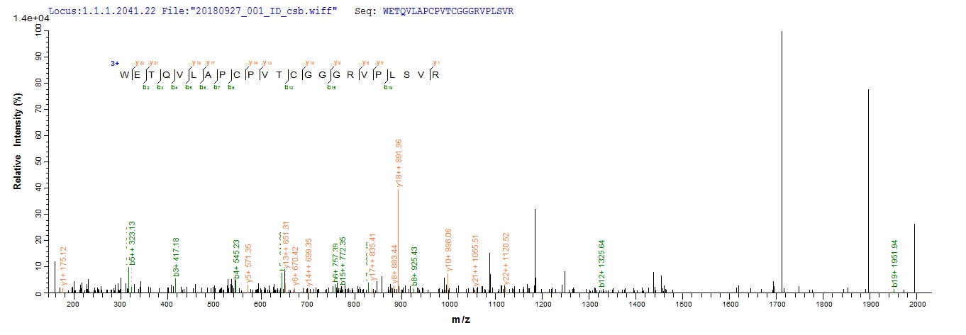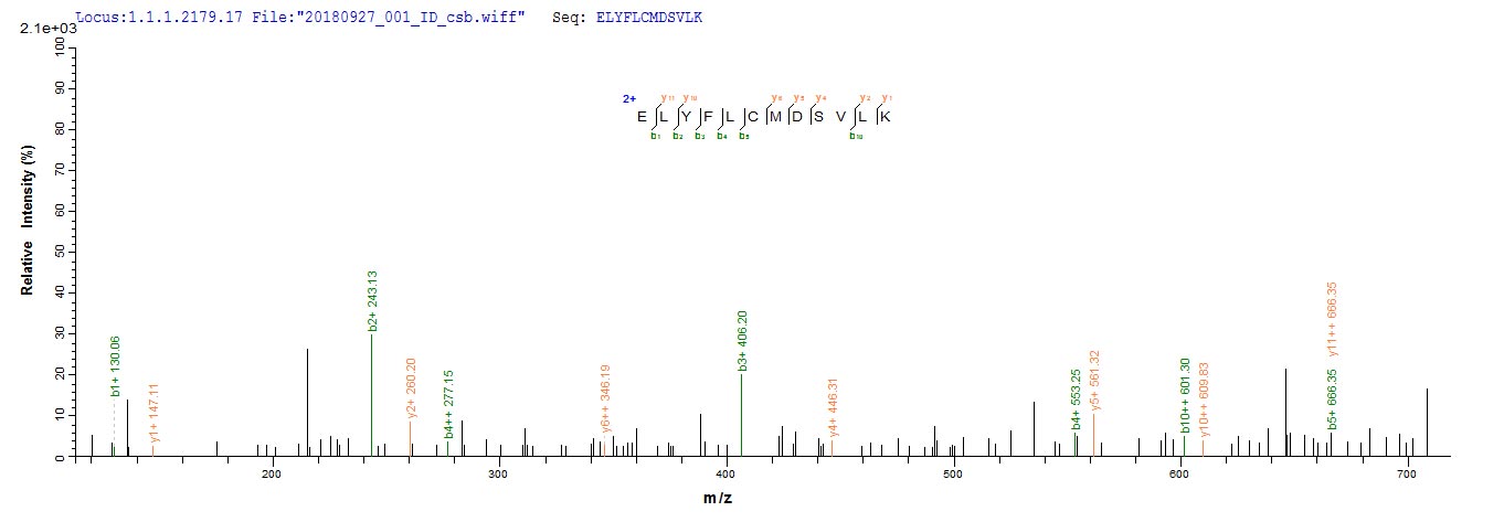 Based on the SEQUEST from database of E.coli host and target protein, the LC-MS/MS Analysis result of CSB-EP745079MO could indicate that this peptide derived from E.coli-expressed Mus musculus (Mouse) Adamts13.