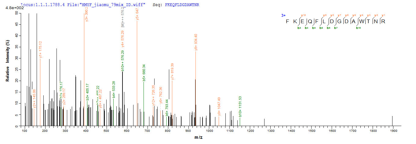 Based on the SEQUEST from database of Yeast host and target protein, the LC-MS/MS Analysis result of CSB-YP004458MO could indicate that this peptide derived from Yeast-expressed Mus musculus (Mouse) Calr.