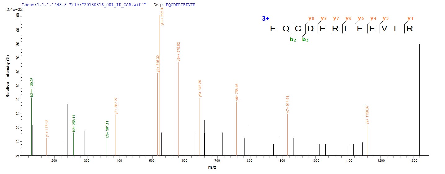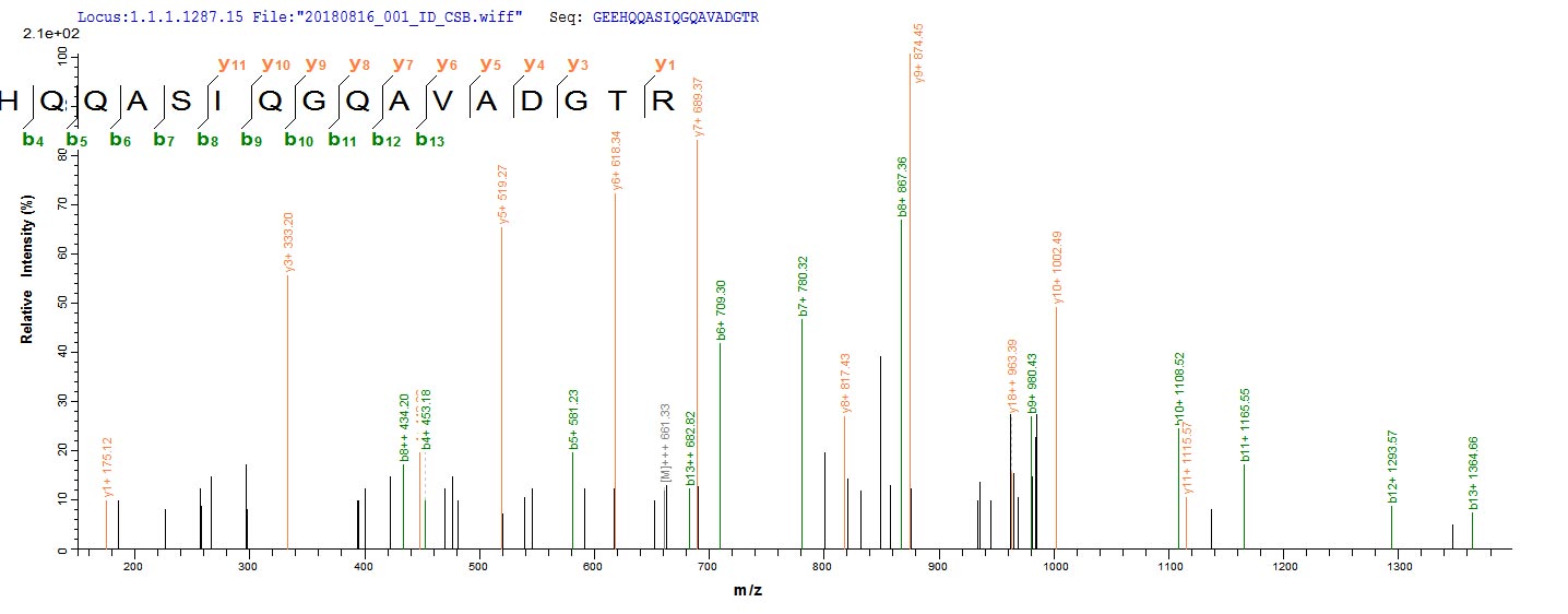 Based on the SEQUEST from database of E.coli host and target protein, the LC-MS/MS Analysis result of CSB-EP009666MO could indicate that this peptide derived from E.coli-expressed Mus musculus (Mouse) Golm1.