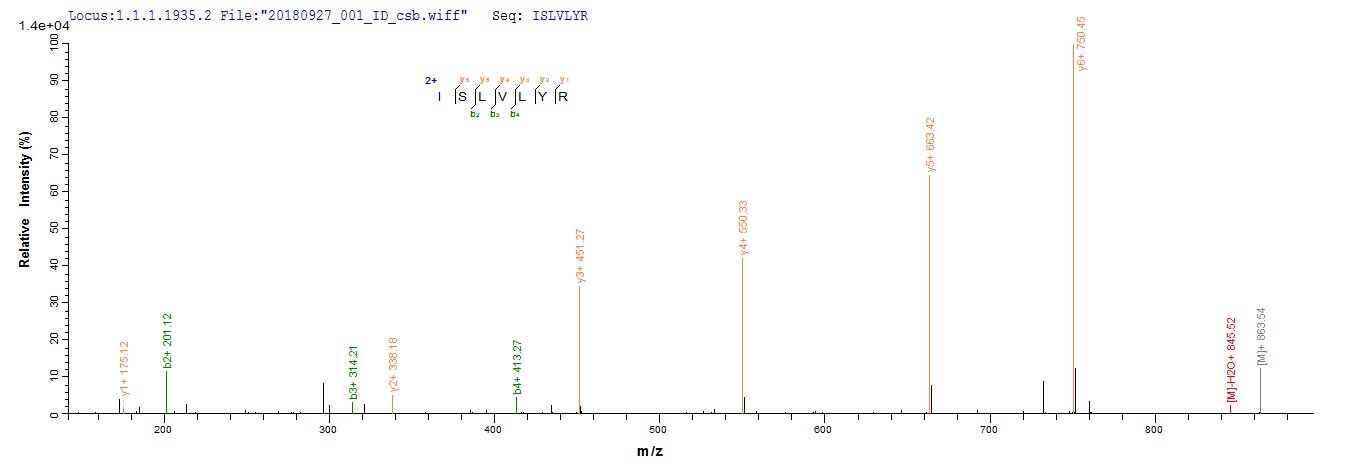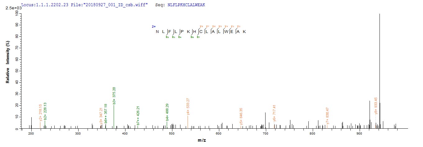 Based on the SEQUEST from database of E.coli host and target protein, the LC-MS/MS Analysis result of CSB-EP678395MO could indicate that this peptide derived from E.coli-expressed Mus musculus (Mouse) Tet2.