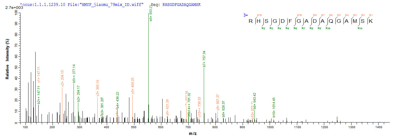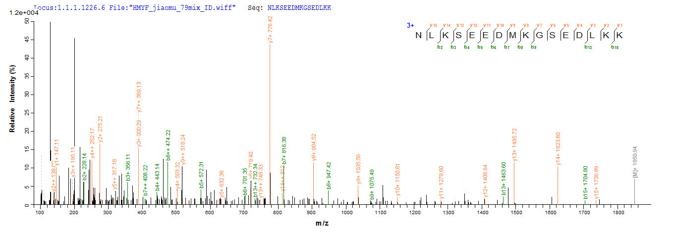 Based on the SEQUEST from database of E.coli host and target protein, the LC-MS/MS Analysis result of CSB-EP013529MO could indicate that this peptide derived from E.coli-expressed Mus musculus (Mouse) Mb.
