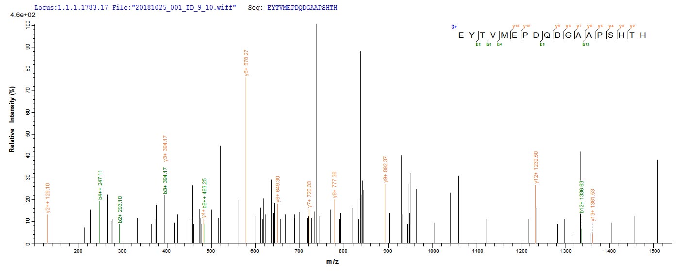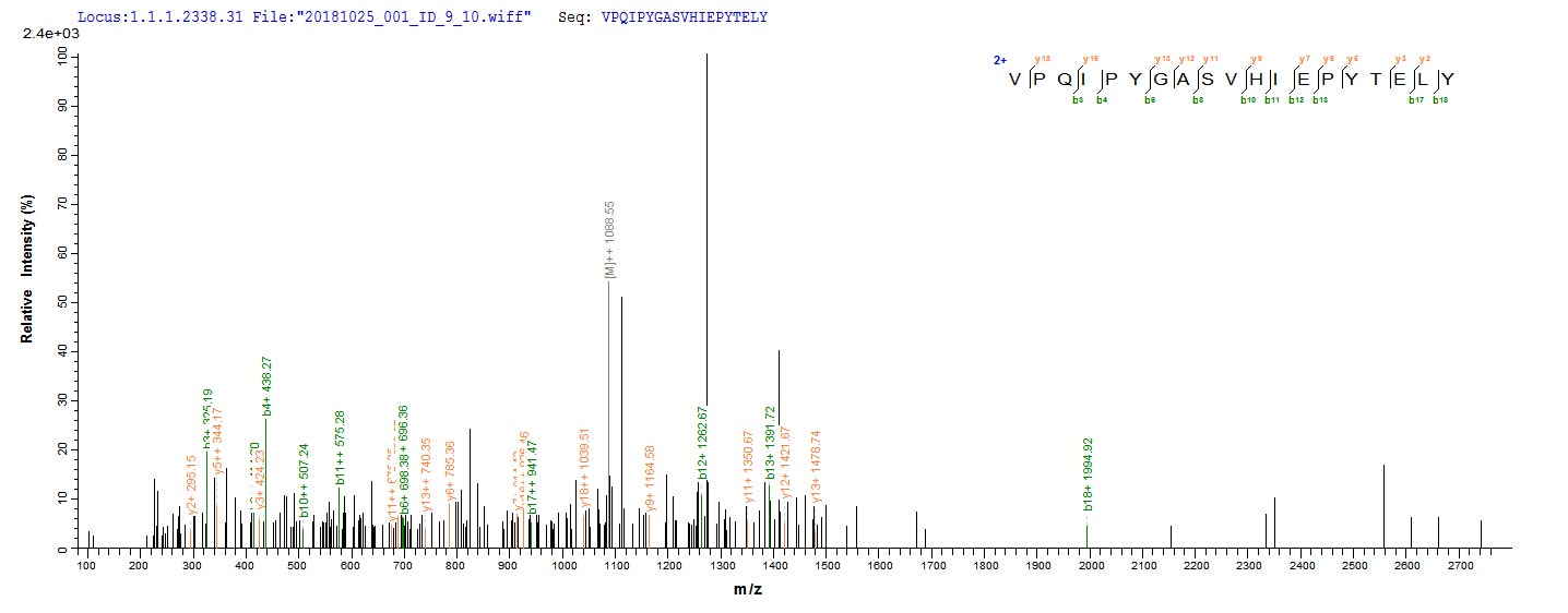 Based on the SEQUEST from database of Yeast host and target protein, the LC-MS/MS Analysis result of CSB-YP015802MO could indicate that this peptide derived from Yeast-expressed Mus musculus (Mouse) Nid1.