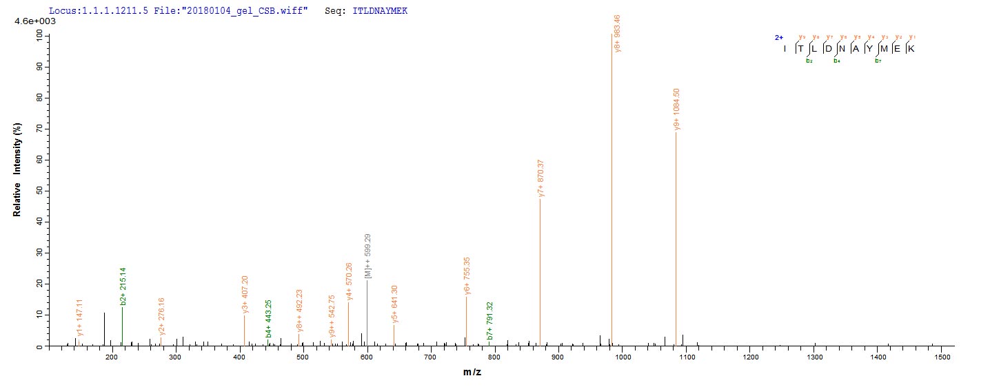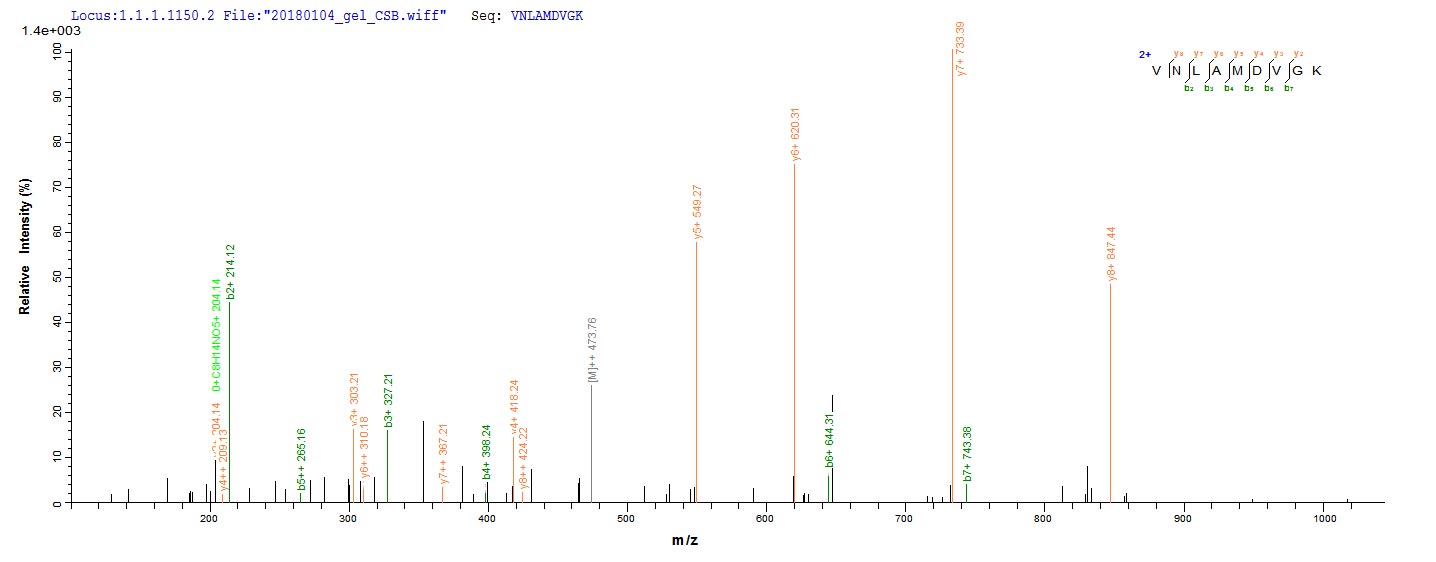 Based on the SEQUEST from database of E.coli host and target protein, the LC-MS/MS Analysis result of CSB-EP018072MO could indicate that this peptide derived from E.coli-expressed Mus musculus (Mouse) Pkm.