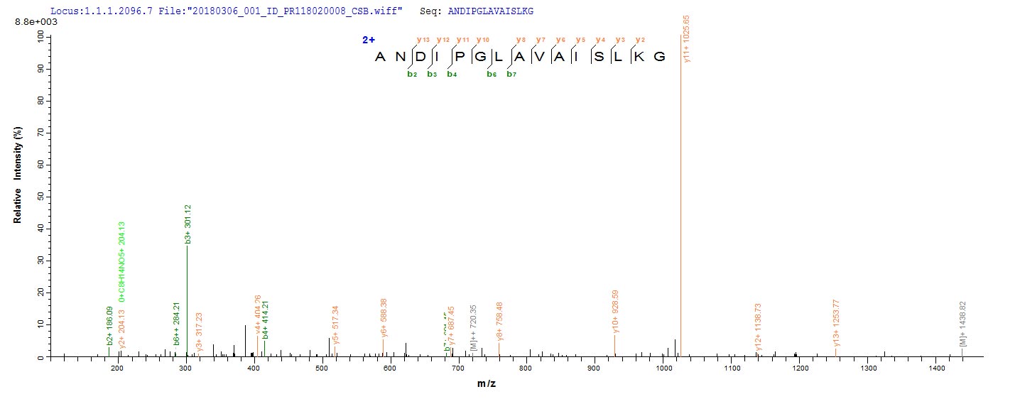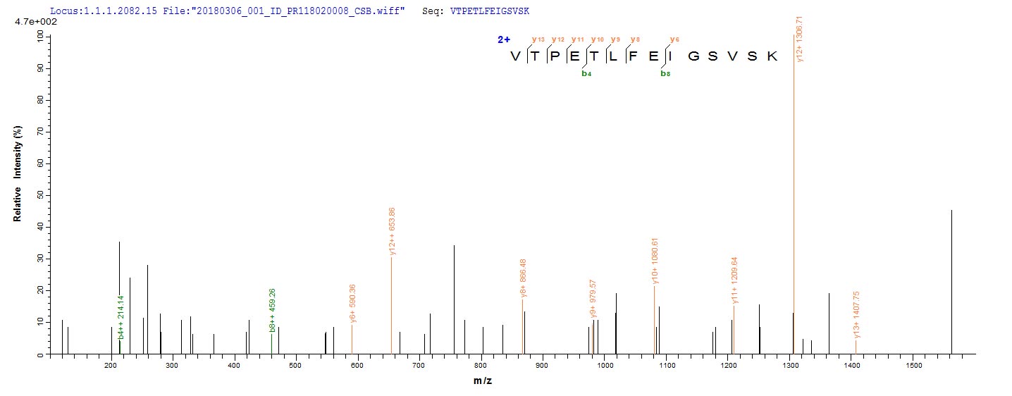 Based on the SEQUEST from database of E.coli host and target protein, the LC-MS/MS Analysis result of CSB-EP326492EZX could indicate that this peptide derived from E.coli-expressed Pseudomonas aeruginosa (strain ATCC 15692 / DSM 22644 / CIP 104116 / JCM 14847 / LMG 12228 / 1C / PRS 101 / PAO1) ampC.