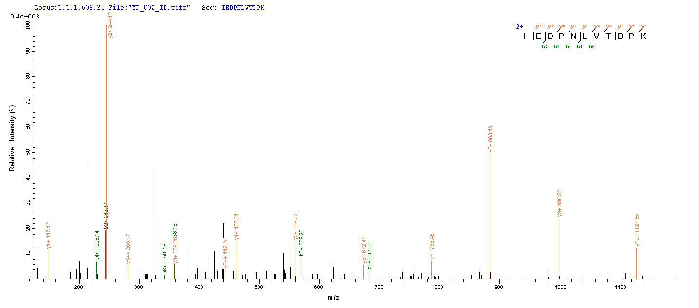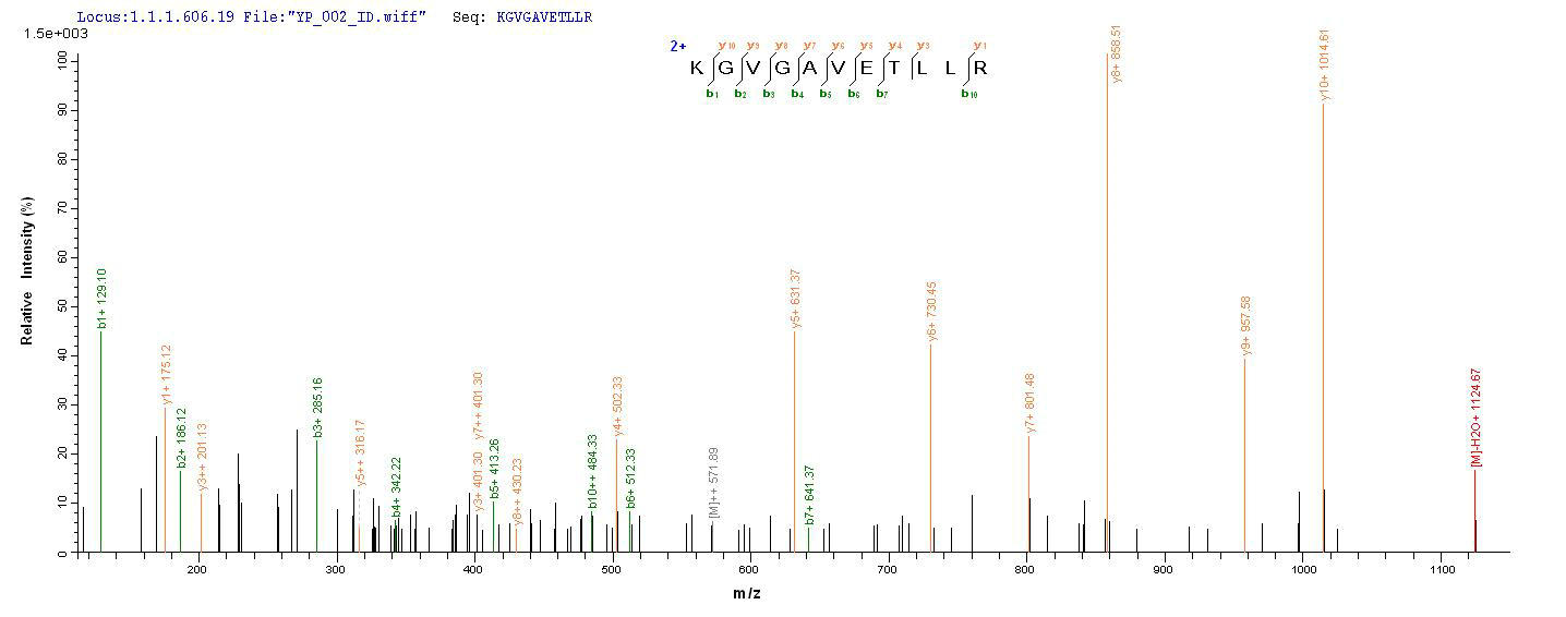 Based on the SEQUEST from database of Yeast host and target protein, the LC-MS/MS Analysis result of CSB-YP331347SXB could indicate that this peptide derived from Yeast-expressed Salmonella typhimurium (strain LT2 / SGSC1412 / ATCC 700720) prgJ.