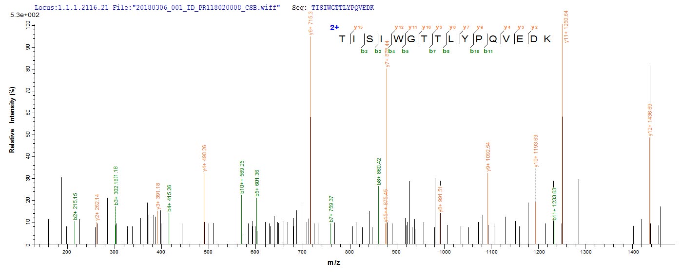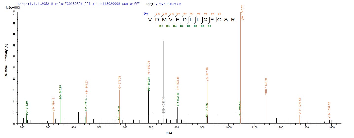 Based on the SEQUEST from database of E.coli host and target protein, the LC-MS/MS Analysis result of CSB-EP312102FNF could indicate that this peptide derived from E.coli-expressed Streptococcus pneumoniae serotype 2 (strain D39 / NCTC 7466) ply.