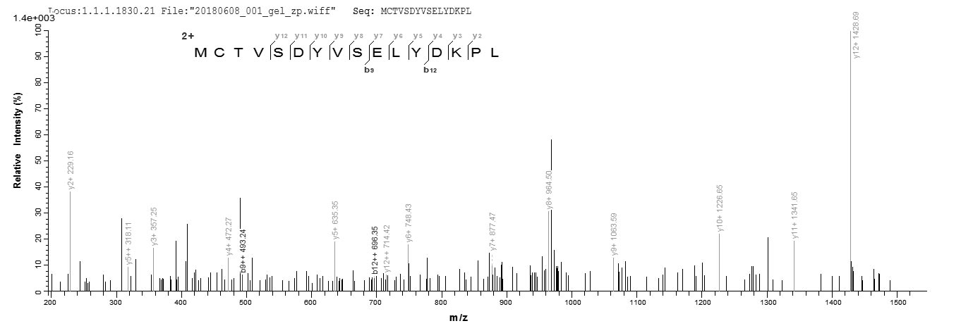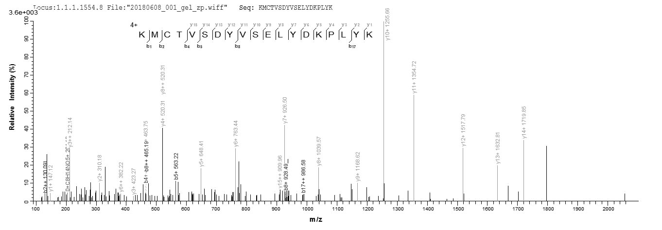 Based on the SEQUEST from database of Baculovirus host and target protein, the LC-MS/MS Analysis result of CSB-BP335028VAF could indicate that this peptide derived from Baculovirus-expressed Vaccinia virus (strain LC16m8) (VACV) PS/HR.