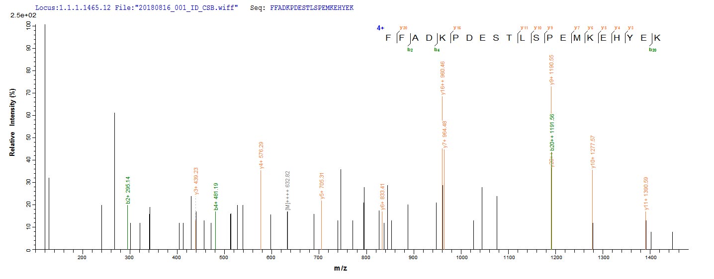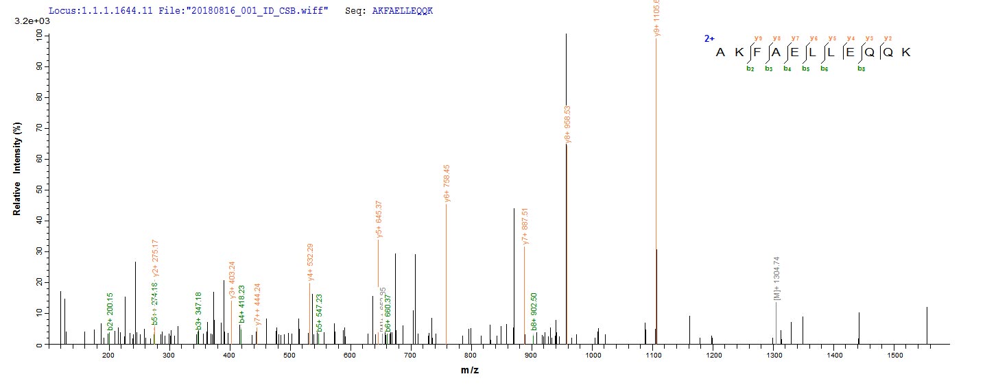 Based on the SEQUEST from database of E.coli host and target protein, the LC-MS/MS Analysis result of CSB-EP880045TQY could indicate that this peptide derived from E.coli-expressed Trypanosoma cruzi KMP-11.