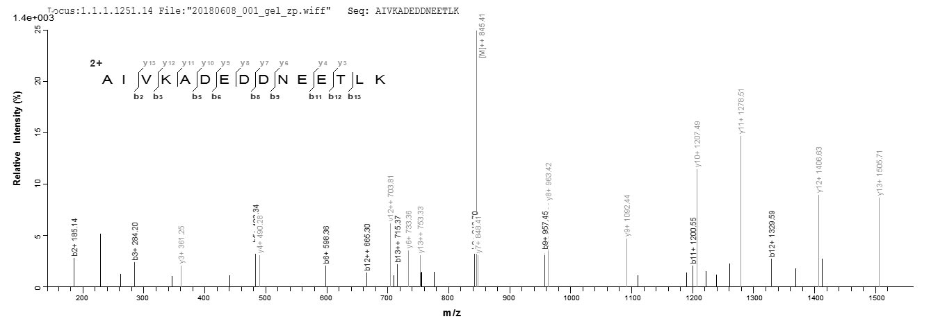 Based on the SEQUEST from database of Yeast host and target protein, the LC-MS/MS Analysis result of CSB-YP324948VAA could indicate that this peptide derived from Yeast-expressed Vaccinia virus (strain Copenhagen) (VACV) A27L.