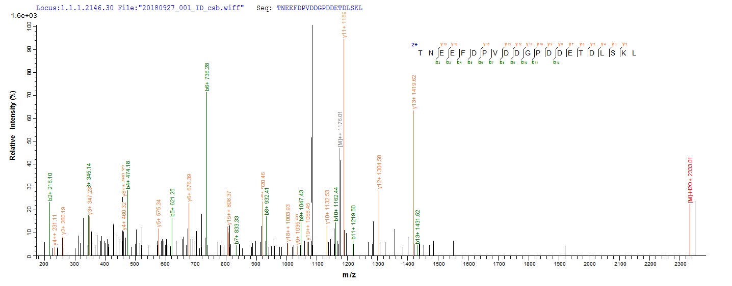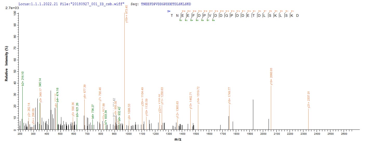 Based on the SEQUEST from database of Yeast host and target protein, the LC-MS/MS Analysis result of CSB-YP312446VAI could indicate that this peptide derived from Yeast-expressed Vaccinia virus (strain Western Reserve) (VACV) (Vaccinia virus (strain WR)) PS/HR.