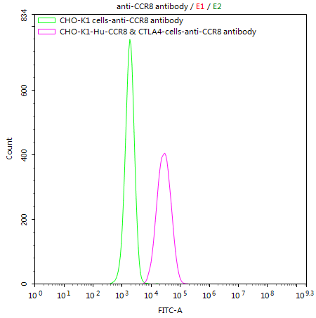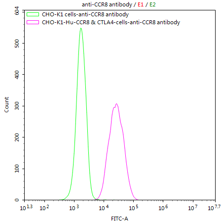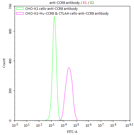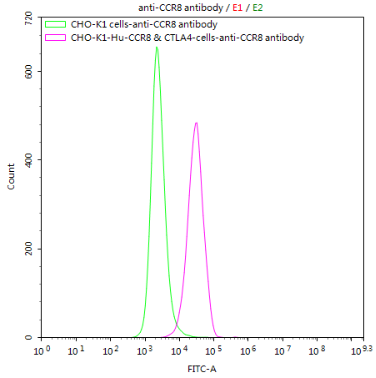 Untransfected CHO-K1 cells (green line) and transfected Human CCR8 & CTLA4 CHO-K1 stable cells (red line) were stained with anti-CCR8 antibody (CSB-RA004847MA2HU) (2μg/1*106cells), washed and then followed by FITC-conjugated anti-Human IgG Fc antibody and analyzed with flow cytometry.