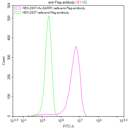 Untransfected HEK293T cells (green line) and transfected Human SARM1 HEK293T Stable cells (red line) were stained with anti-Flag antibody (2μg/1*106cells), washed and then followed by FITC-conjugated anti-Mouse IgG Fc antibody and analyzed with flow cytometry.