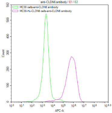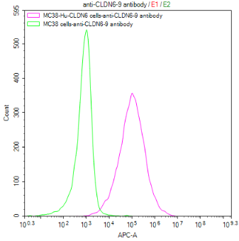 Untransfected MC38 cells (green line) and transfected Human CLDN6 MC38 stable cells (red line) were stained with anti-CLDN6/9 antibody (CSB-RA005508MA1HU) (2μg/1*106cells), washed and then followed by APC-conjugated anti-Human IgG Fc antibody and analyzed with flow cytometry.