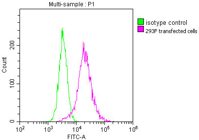 Overlay histogram showing 293F transfected cells stained with CSB-MA000141M0m (red line) at 1:100. The cells were incubated in 1x PBS /10% normal goat serum to block non-specific protein-protein interactions followed by primary antibody for 1 h at 4°C. The secondary antibody used was FITC goat anti-mouse IgG(H+L) at 1/200 dilution for 1 h at 4°C. Isotype control antibody (green line) was used under the same conditions. Acquisition of >10,000 events was performed.
