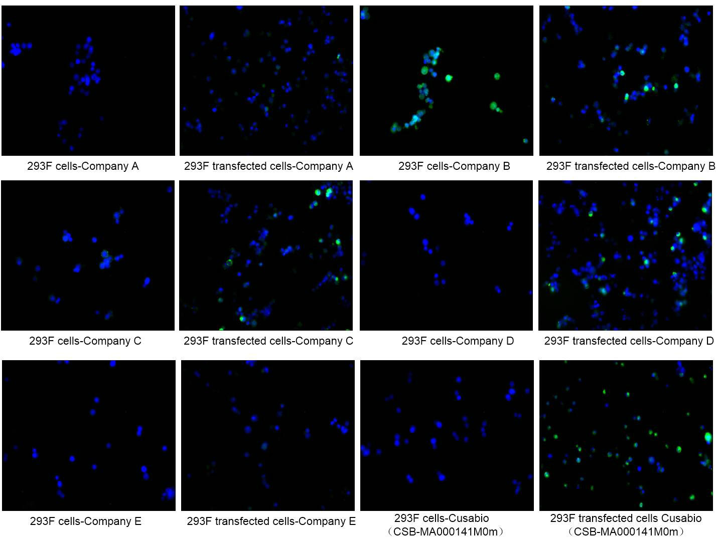 Immunofluorescence staining of 293F cells and 293F transfected cells with Company A, Company B, Company C, Company D, Company E, CSB-MA000141M0m at 1:100, counter-stained with DAPI. The cells were blocked in 10% normal Goat Serum and then incubated with the primary antibody overnight at 4°C. The secondary antibody was Alexa Fluor 488-congugated AffiniPure Goat Anti-Mouse IgG(H+L).