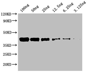 Positive WB detected in: Recombinant protein from Mammalian cell with Avi tag from E.coli at 100ng, 50ng, 25ng, 12.5ng, 6.25ng, 3.125ng All lanes: Avi tag antibody at 1:1000