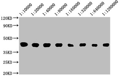 Positive WB detected in: 50ng Recombinant protein with Avi tag from Mammalian cell Avi tag antibody at 1:10000, 1:20000, 1:40000, 1:80000, 1:160000, 1:320000, 1:640000, 1:1280000