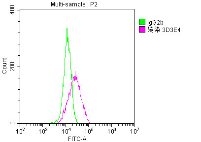 Overlay Peak curve showing 293F cells transfected with GST stained with CSB-MA000031M1m (red line) at 1:189. The cells were fixed in 4% formaldehyde and permeated by 0.2% TritonX-100. Then 10% normal goat serum was Incubated to block non-specific protein-protein interactions followed by the antibody (1μg/1*106cells) for 1 h at 4°C. The secondary antibody used was FITC-conjugated Goat Anti-Mouse IgG(H+L) at 1/100 dilution for 30min at 4°C. Isotype control antibody (green line) was mouse IgG2b (1μg/1*106cells) used under the same conditions. Acquisition of >10,000 events was performed.