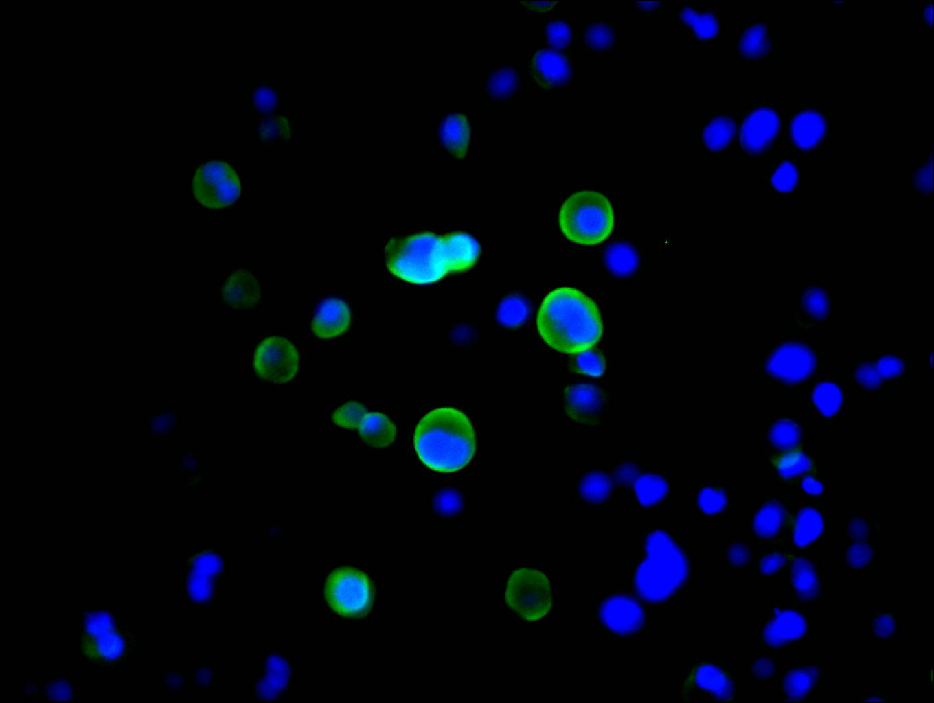 Immunofluorescence staining of 293F transfected cells with CSB-MA000031M1m at 1:94.5, counter-stained with DAPI. The cells were blocked in 10% normal Goat Serum and then incubated with the primary antibody overnight at 4°C. The secondary antibody was Alexa Fluor 488-congugated AffiniPure Goat Anti-Mouse IgG(H+L).