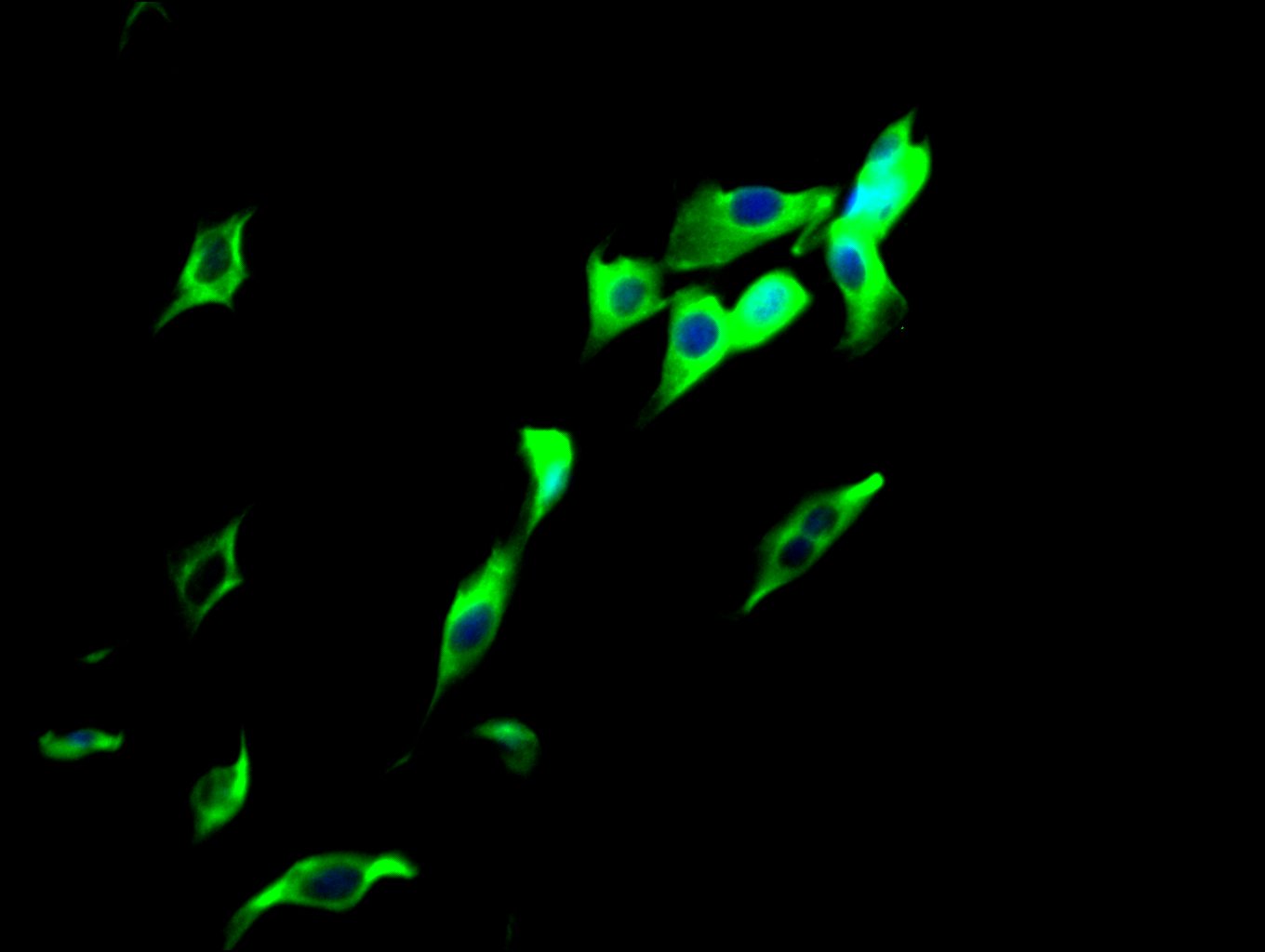 Immunofluorescence staining of Hela cells with CSB-MA025318A0m at 1:100, counter-stained with DAPI. The cells were fixed in 4% formaldehyde, permeated by 0.2% TritonX-100, and blocked in 10% normal Goat Serum. The cells were then incubated with the antibody overnight at 4°C. Nuclear DNA was labeled in blue with DAPI. The secondary antibody was FITC-conjugated AffiniPure Goat Anti-Mouse IgG(H+L).