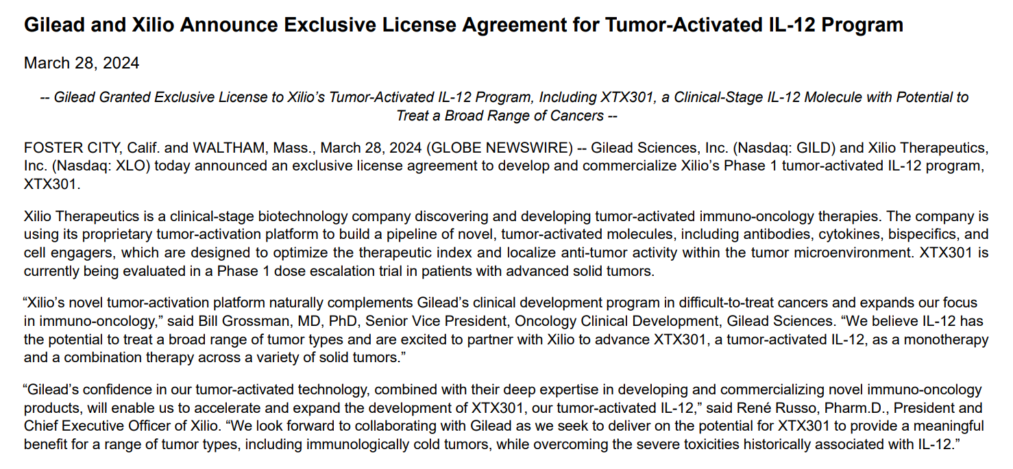3月28日,吉利德科學(xué)(GILD US)和Xilio Therapeutics宣布達(dá)成一項獨家許可協(xié)議,雙方將共同開發(fā)和商業(yè)化后者的腫瘤激活白介素12(IL-12)