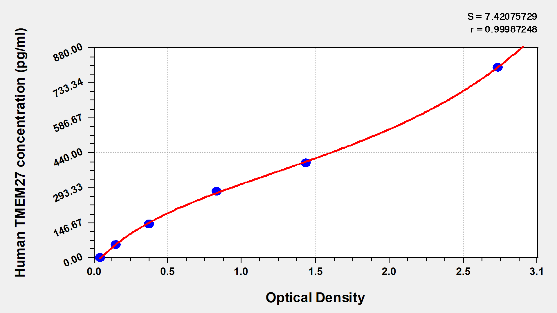 通過線性范圍來(lái)計(jì)算出實(shí)際的檢測(cè)樣本值,定量試劑盒標(biāo)準(zhǔn)曲線的相關(guān)系數(shù)R大于0.99。以CSB-E07270h(人脂聯(lián)素(ADP)ELISA Kit)為例的標(biāo)準(zhǔn)曲線。