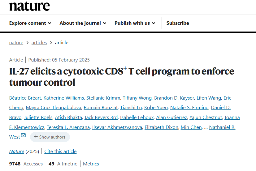 01 靶點(diǎn):IL-27應(yīng)用:結(jié)直腸癌、肺癌等癌癥潛在治療靶點(diǎn)來(lái)源:IL-27 elicits a cytotoxic CD8 + T cell program to enforce tum