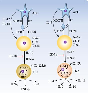 根據(jù)它們合成和分泌的細(xì)胞因子,CD4+輔助T細(xì)胞(Th細(xì)胞)可以分為兩個(gè)亞群,即第一型輔助T淋巴細(xì)胞(