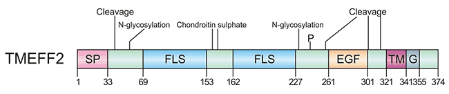 TMEFF2作為具有表皮生長(zhǎng)因子EGF樣和FS樣結(jié)構(gòu)域蛋白,胞外區(qū)FS樣功能域,可與轉(zhuǎn)化生長(zhǎng)因子-β家族(TGF-β超家族)、血管內(nèi)皮生長(zhǎng)因子(VEGF)以及血小板衍生生長(zhǎng)因子(PDGF)等結(jié)合,并抑制其受體活化;胞外區(qū)EGF樣結(jié)構(gòu),可參與細(xì)胞內(nèi)的信號(hào)轉(zhuǎn)導(dǎo) [2]。
