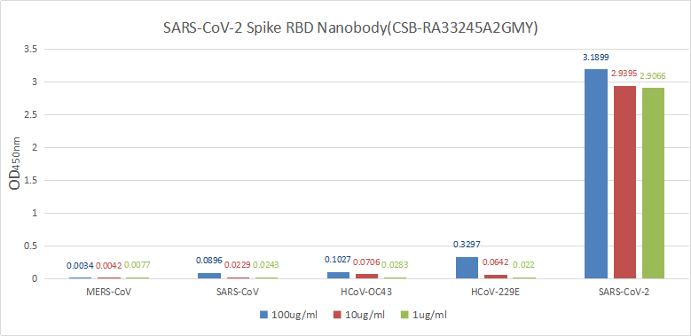 Immobilize various SARS proteins at concentration of 2μg/ml on solid substrate, then react with the nanobody at concentration of 100μg/ml, 10μg/ml and 1μg/ml. It shows this nanobody is specific for SARS-CoV-2-S1-RBD protein, without any cross-reactivity with MERS-CoV, SARS-CoV, HCoV-OC43 or HCoV-229E.