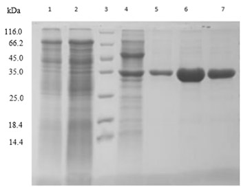 難點(diǎn):酵母胞內(nèi)表達(dá),破菌后純化,可以看出裂解液中雜蛋白非常多(泳道1),目的蛋白非常不明顯,經(jīng)過酵母系統(tǒng)特有的層析系統(tǒng)一次純化,用SDS-PAGE檢測(cè)看不到雜帶,純度達(dá)到95%以上(泳道6-7)。